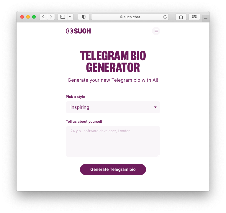 Create a standout Telegram bio effortlessly with SUCH's AI-powered Bio Generator—funny, professional, or stylish bios in seconds!