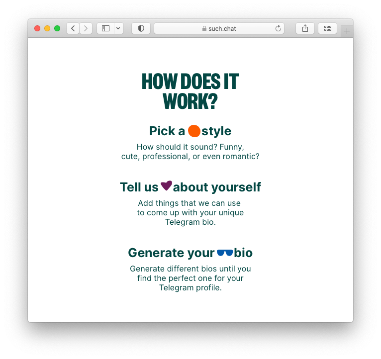 Ready to upgrade your Telegram bio? Try the SUCH Telegram Bio Generator today and craft a unique, engaging, and stylish bio in seconds!