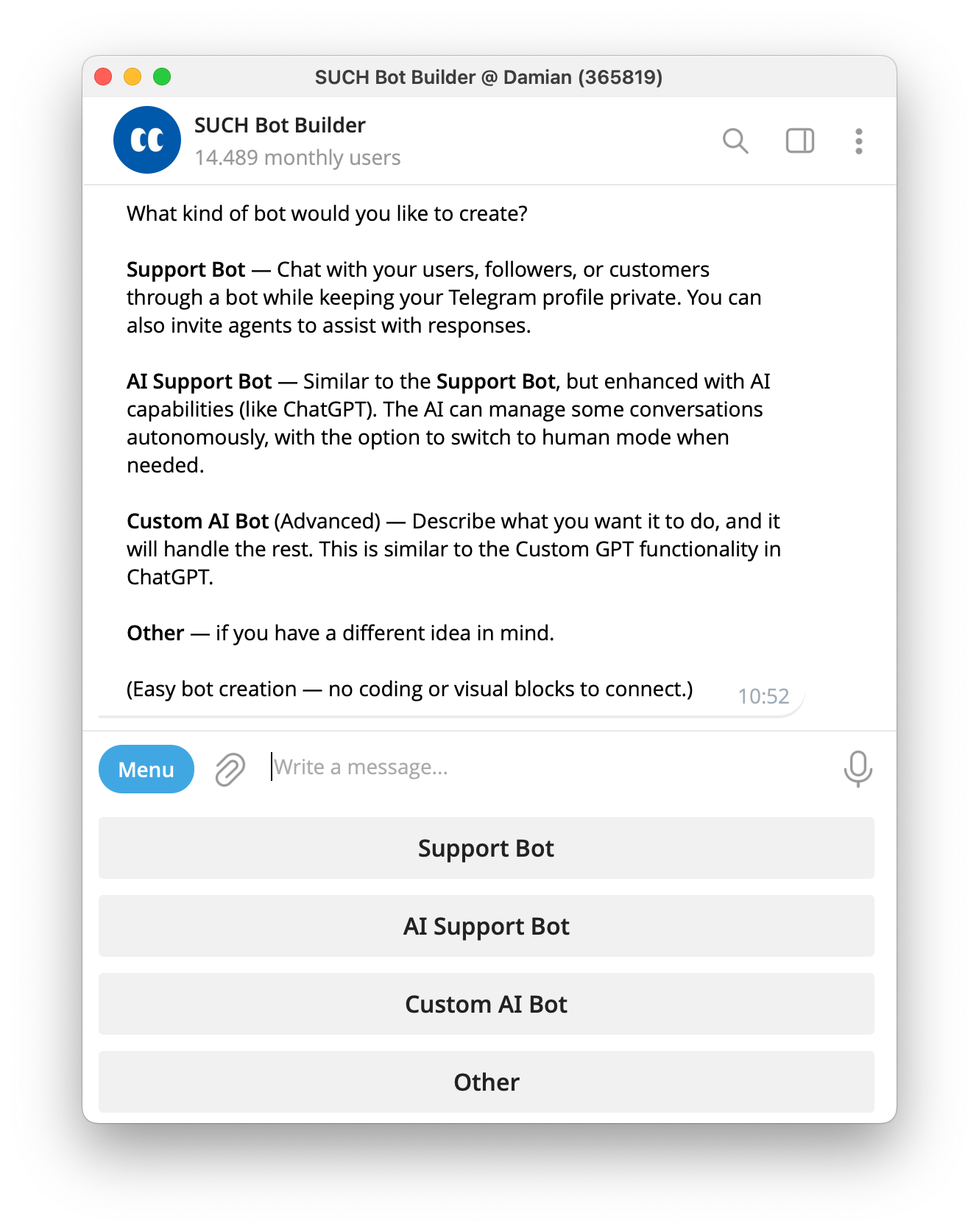 It costs nothing to create and deploy your Telegram bot with SUCH. You can have a fully functional support chatbot running without any upfront payment, technical skills, or coding.