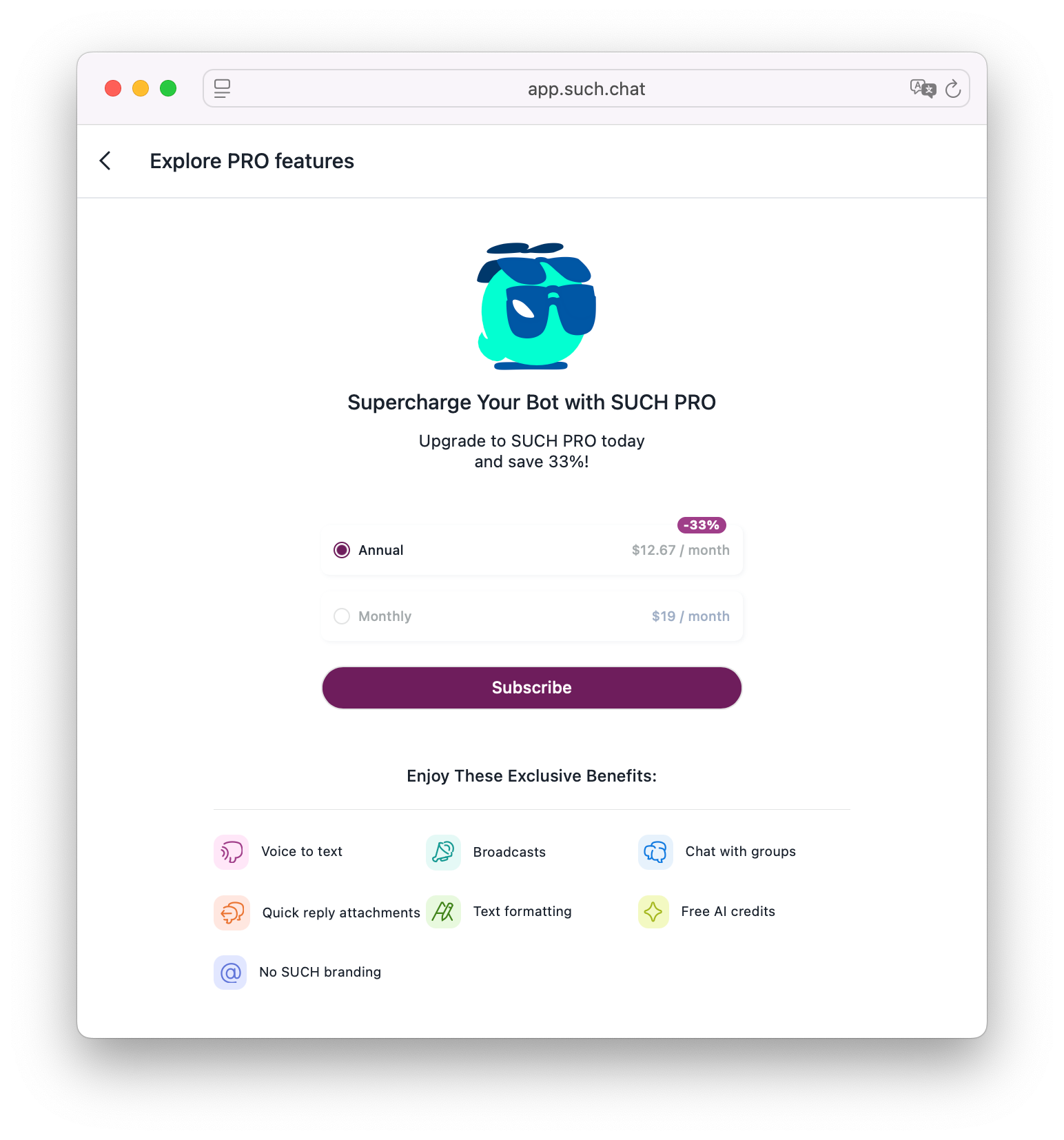 For extra features, upgrading your SUCH bot to PRO gives you advanced capabilities like removing the bot’s branding, sending broadcast messages to all users, using voice-to-text, and more.