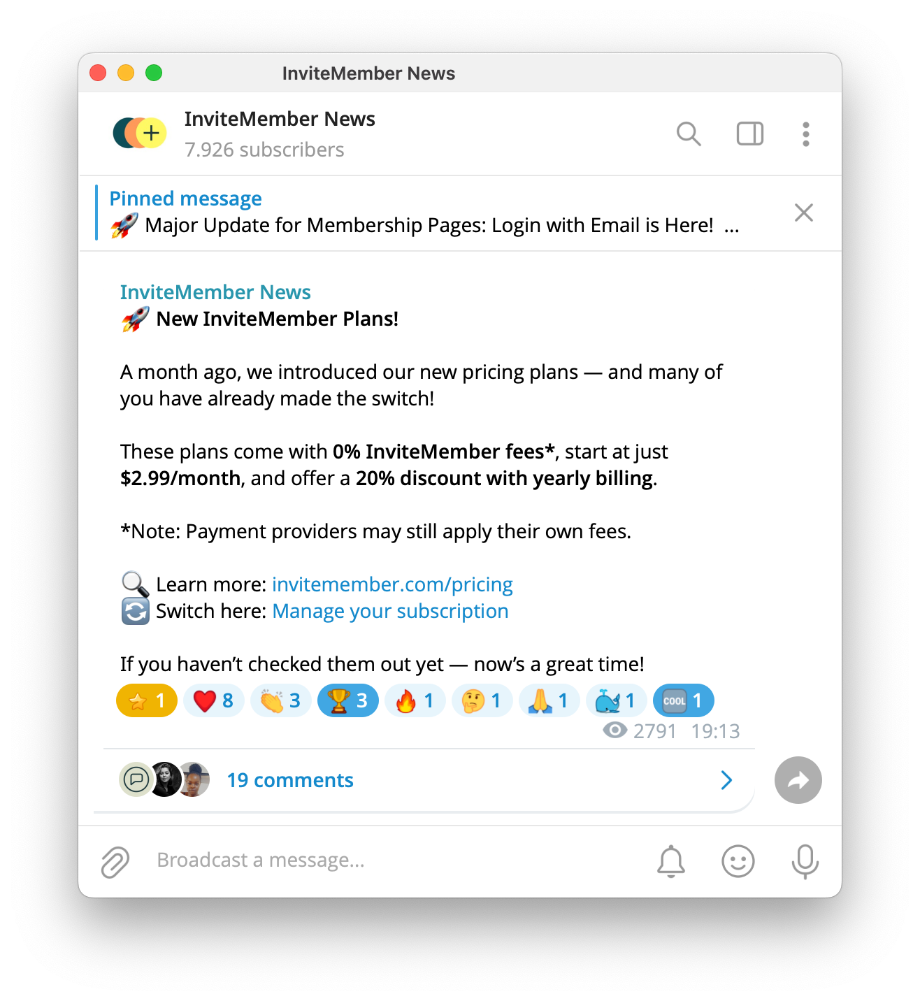The messages/posts are labeled with the channel’s name, not yours as an individual, which keeps the focus on the content. New subscribers can usually see the entire history of messages posted in the channel, so they won't miss past announcements.