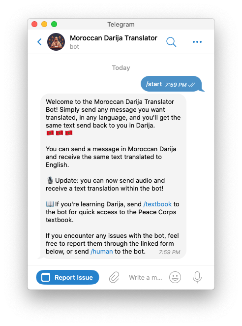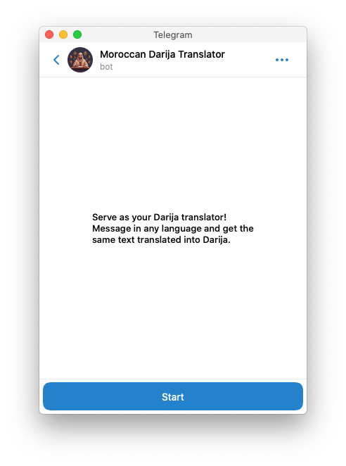 A friendly welcome message greets new users and guides them on how to interact with your bot.