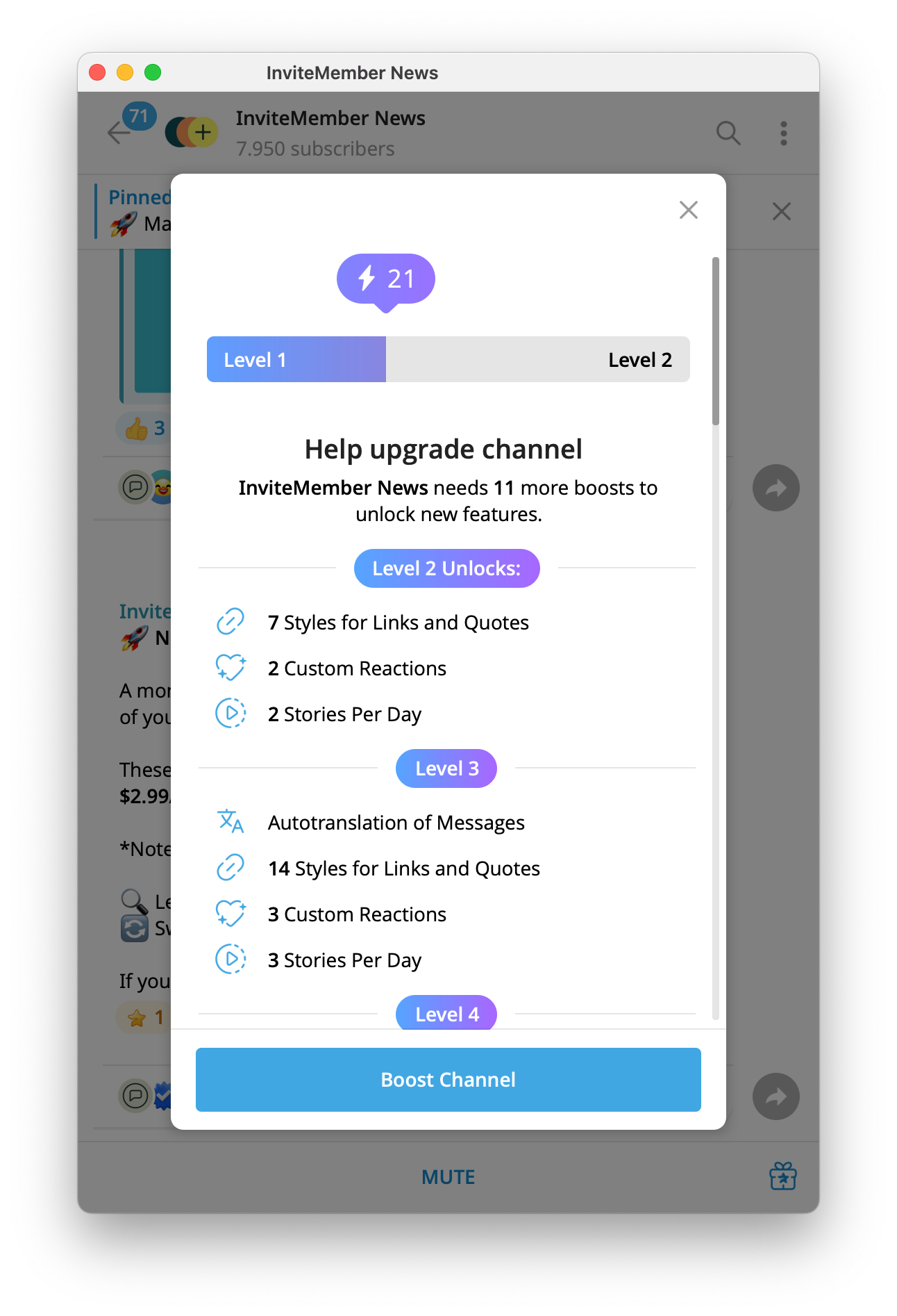 When a channel gains enough telegram boost levels, it unlocks tools: